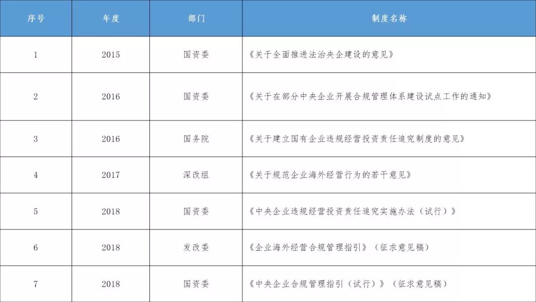 表1:2015-2018中央企业主管部门出台的部分合规制度