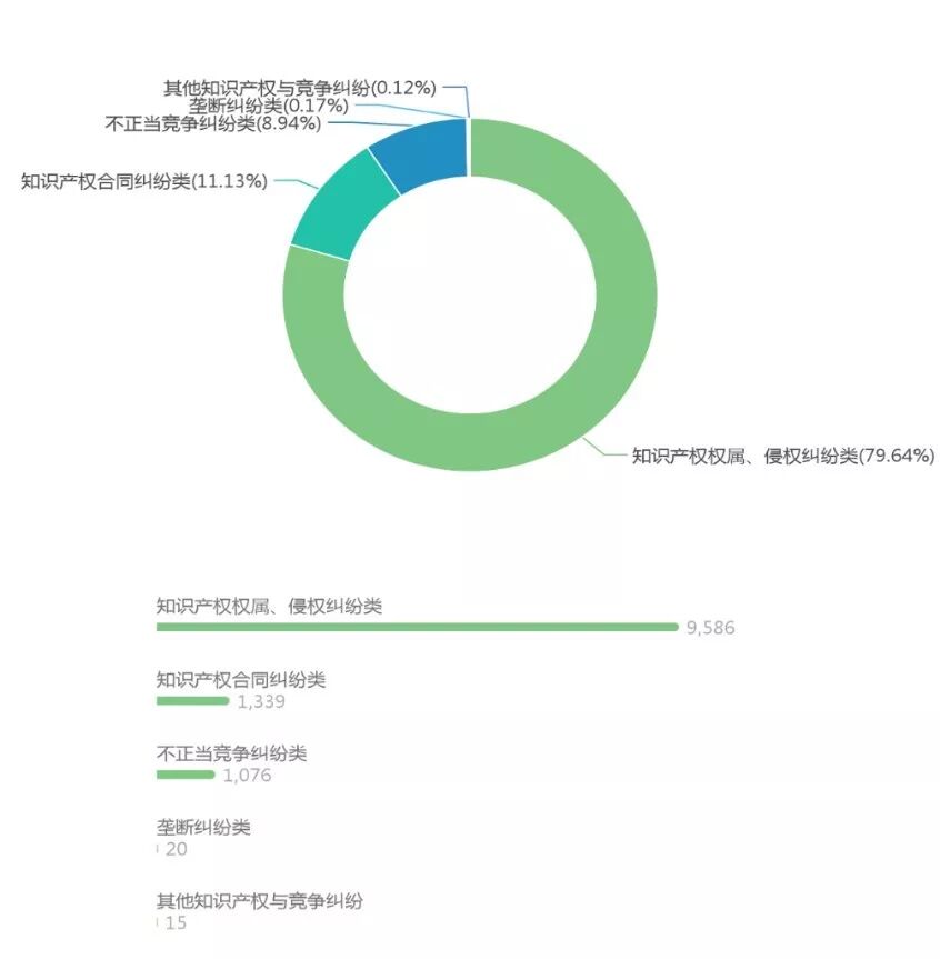 从案件类型来看,如下图所示,知识产权与竞争纠纷当前最主要的案由是知识产权权属、侵权纠纷类,有9586件,占一半以上,其次是知识产权合同纠纷类1339件,不正当竞争纠纷类1076件,垄断纠纷类20件,其他知识产权与竞争纠纷15件。