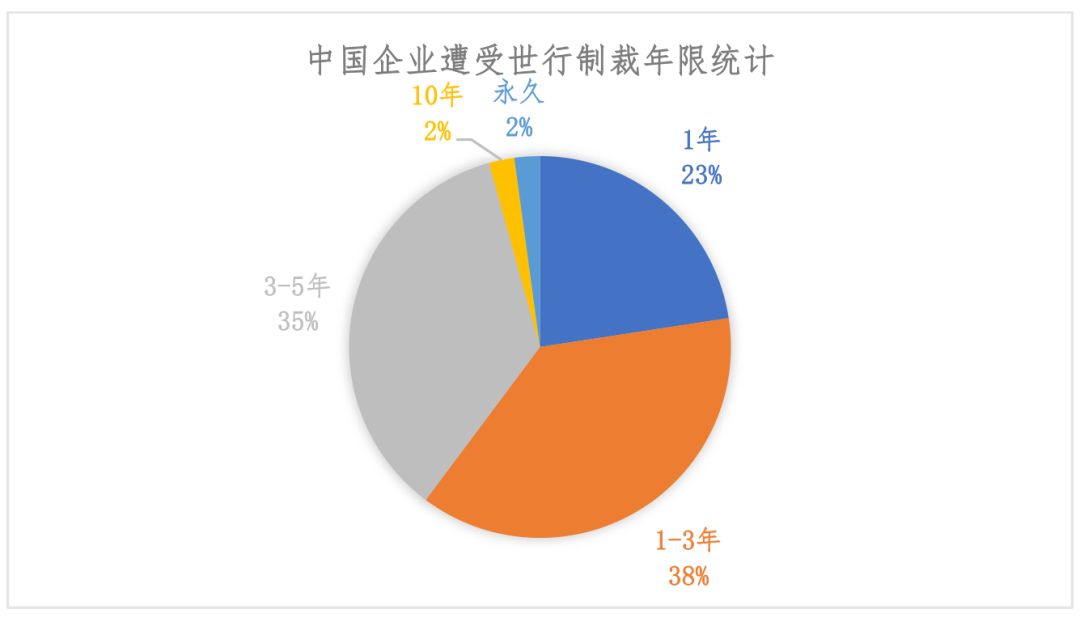 数据显示,2009年以来,受世行制裁的中国企业数量总体呈上升趋势,尤其是最近三年,被列入制裁名单的中国企业显著增多。[2]2017年,国内受制裁企业数量达到21家,2018年激增到44家,而2019年仅前五个月,受制裁中国企业已经达到23家。[3]截至2019年5月,共有114家中国实体和个人受到世行制裁。[4]此外,由下图可见,相当比例的中国企业受制裁期限超过1年,意味着受制裁企业可能面临世界银行集团、亚洲发展银行、非洲开发银行等多家多边金融机构联合制裁,导致被禁止参与上述所有机构资助的建设工程项目,遭受经济、声誉上的巨大损失。