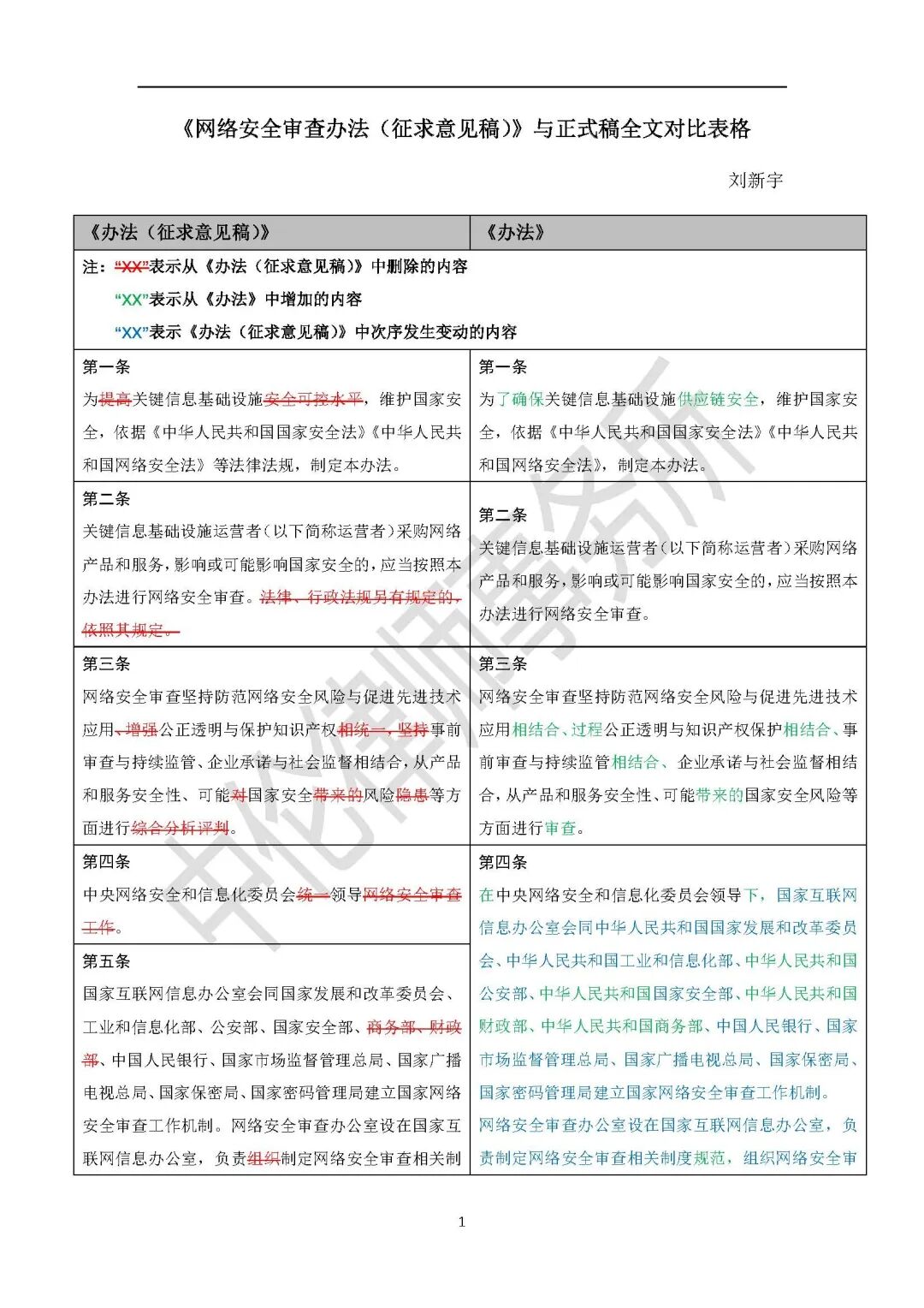 而在一年前,2019年5月24日,国家互联网信息办公室发布了《国家互联网信息办公室关于<网络安全审查办法(征求意见稿)>公开征求意见的通知》(落款时间为2019年5月21日,以下简称“《办法(征求意见稿)》”)。为了帮助大家更好地理解《办法》的规定,接下来将通过与征求意见稿逐条对比的方式,为大家进行全文解读。(文末附《办法》与《办法(征求意见稿)》全文对比表格,供大家参考)