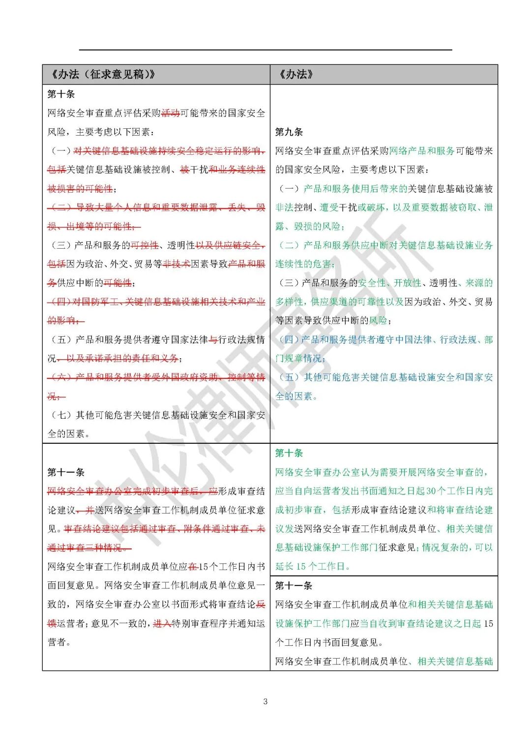 从网络安全审查的主要考虑因素看,相较于《办法(征求意见稿)》第十条,《办法》删去了“对国防军工、关键信息基础设施相关技术和产业的影响”和“产品和服务提供者受外国政府资助、控制等情况”,新增了“产品和服务……来源的多样性,供应渠道的可靠性”的要求,并将“产品和服务提供者遵守国家法律与行政法规情况”扩张至“产品和服务提供者遵守中国法律、行政法规、部门规章情况”。可以看出,《办法》删去了部分可能产生争议的审查因素,正如国家互联网信息办公室有关负责人就《办法》相关问题答记者问时指出,网络安全审查的目的是维护国家网络安全,不是要限制或歧视国外产品和服务;《办法》进一步强化了对供应链安全的要求,有助于在新形势下更好地维护网络安全和国家安全。