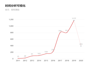 2019年全年,A股股权激励计划总公告数为337个,较2018年、2017年有较大幅度的缩减,然而,多期股权激励计划公告占比提高,说明股权激励已进入“常态化”时代,成为上市公司提高治理能力的有效手段。[1]与此相呼应,有关股权激励争议的案件数量在近年有大幅度的提高。通过在某案件数据库检索“股权激励”这一关键词可以看出,自2017年起,与股权激励相关的案件进入爆发式增长的阶段,到2019年,达到1177件。股权激励案件数量的持续性增加一方面说明股权激励这一制度得到了持续且广泛的应用,另一方面也说明,被激励对象与授予激励股权主体之间的矛盾呈现日益增长的态势。