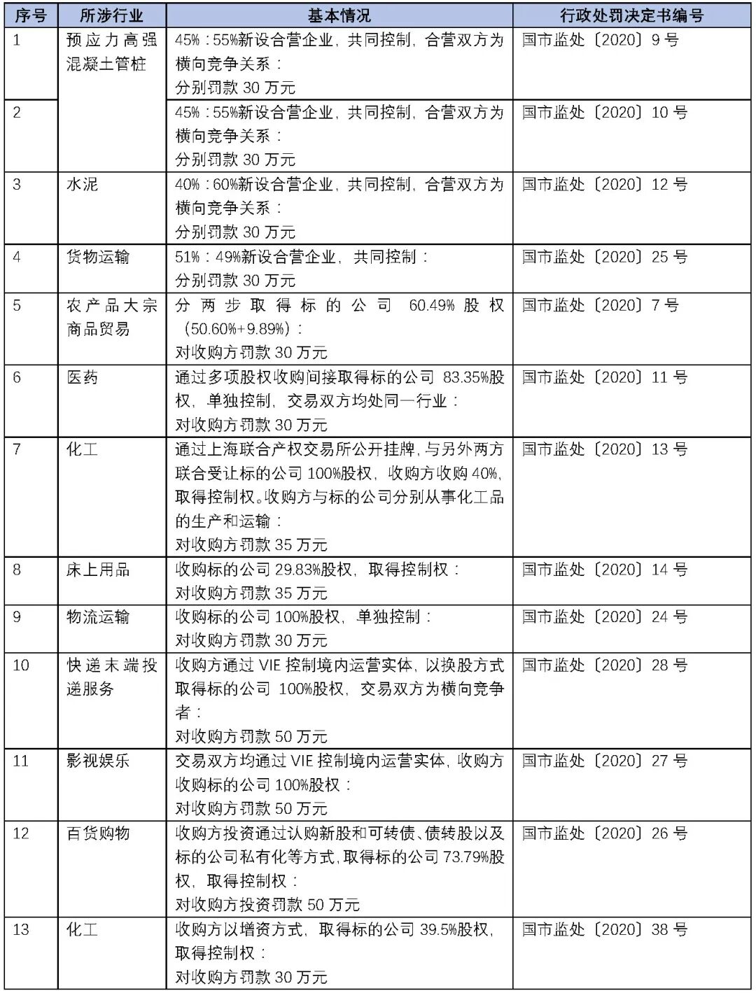 反垄断局对13起未依法申报违法实施经营者集中案件予以行政处罚,合计处罚金额共计580万元,相较于2019年,减少了5起,合计处罚金额减少145万元。但反垄断局于2020年年底对3起涉及VIE结构的违法实施集中案件予以顶格处罚,相比2019年平均30-40万元的罚款,处罚力度有所提升,表明了反垄断局对于强化法律威慑力、规范各类经营者,尤其是平台经营者的决心。