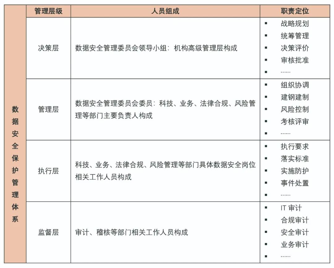 承前所述,信息系统运维与数据安全组织构成金融数据生命周期保护的两大保障。与科技、互联网等公司强依赖于在线系统处理数据安全及保护有所不同,金融业机构工作人员的违规行为某种程度上更容易且频繁地危害金融数据安全,产生侵权后果。在实践中,金融业机构工作人员私自访问、保存并违法对外提供个人金融信息是导致数据安全事件的一大原因。在规范适用上,无论是《证券期货数据分类分级指引》,还是金融数据分级指南、个金技术规范,都强调了良好的组织保障与完善的管理制度对金融数据保护的重要性。对此,周期安全规范细化了管理体系的组织架构与职责定位,如下表5所示[13],并要求金融业机构在不同管理层级上梳理管理流程,拟定管理制度,细化管理要点,实现数据安全的保护闭环。