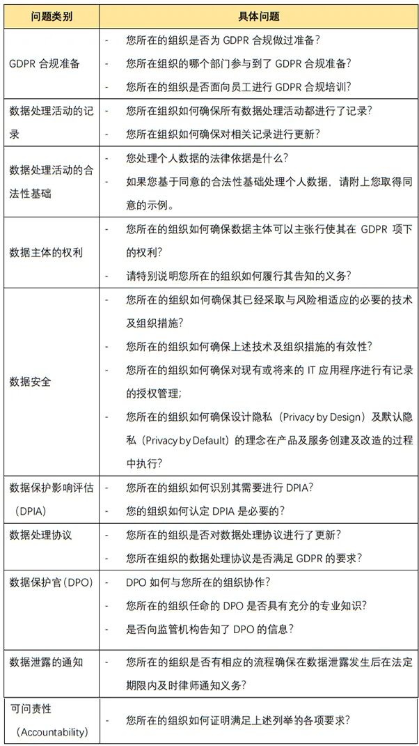 德国联邦层面的数据保护机构为BfDI (Federal Commissioner for Data Protection and Freedom of Information),同时在州层面也设有各自的DPA。在GDPR刚生效后的几个月,下萨克森(Lower Saxony)[4]及巴伐利亚(Bavaria)[5]两个州,即宣布开展随机的GDPR合规审计,并面向相关企业发布了审计问卷。以下萨克森州的合规审计问卷为例,主要包括以下事项[6]: