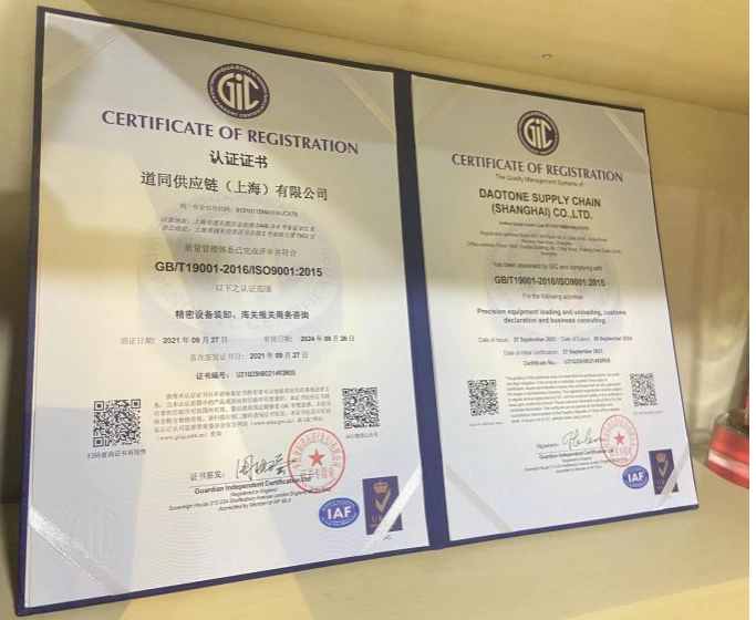 道同供应链(上海)有限公司/上海志禾报关有限公作为中国报关协会理事单位,上海报关协会会员单位,全国进出口商品预归类会员单位,ISO9001(精密设备装卸,海关报关商务咨询)