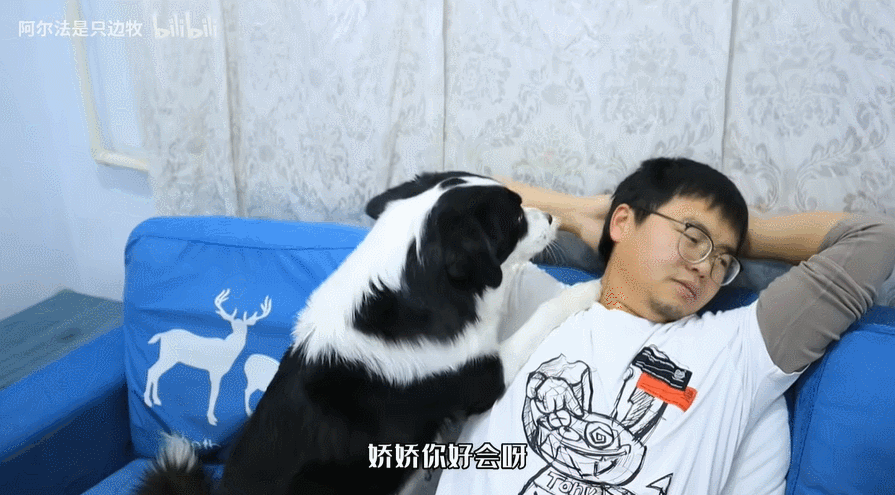 于是,当家里的边牧“阿尔法”紧紧依偎在主人身旁,UP主机智地把手背在身后,以此忍耐想要撸狗的冲动。