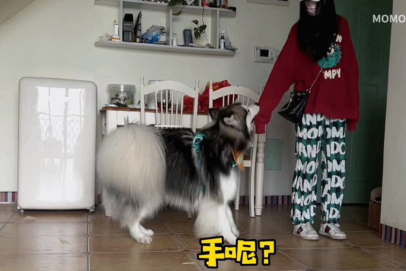 主人表现反常,“MOMO”一会像霸道总裁般来了个壁咚,一会急得直扯袖子,怀疑她是不是在外面有别的狗了。
