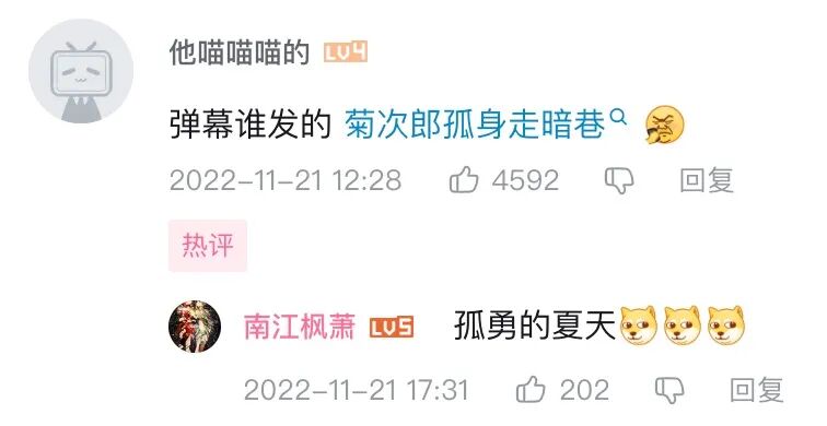 也有人在感动之余,冷不丁在弹幕打出一句“菊次郎孤身走暗巷”,逗笑了其他围观的网友。