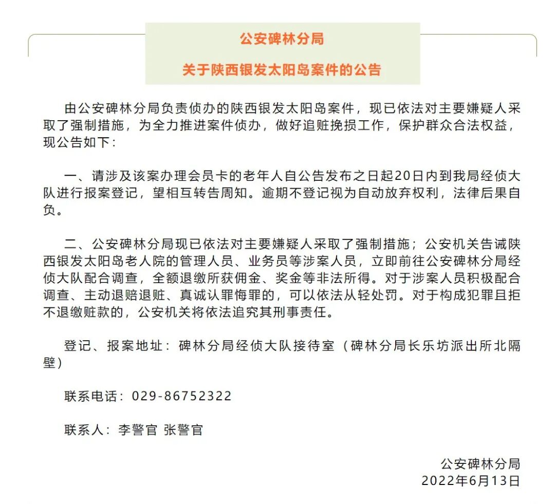记者了解到,由西安市公安局碑林分局负责侦办的陕西银发太阳岛案件,现已依法对主要嫌疑人采取了强制措施,警方发布通告:
