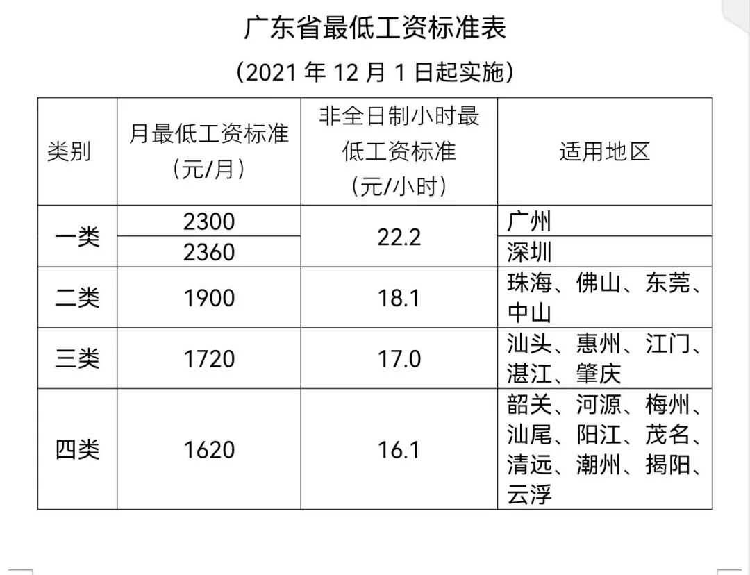 日前,广东省人民政府印发《关于调整我省最低工资标准的通知》,决定从今年12月1日起调整提高月最低工资标准和非全日制小时最低工资标准。调整后,将更好发挥最低工资标准的保障作用,进一步提高低收入劳动者工资收入水平,有利于保障和改善民生,促进高质量发展和共同富裕。
