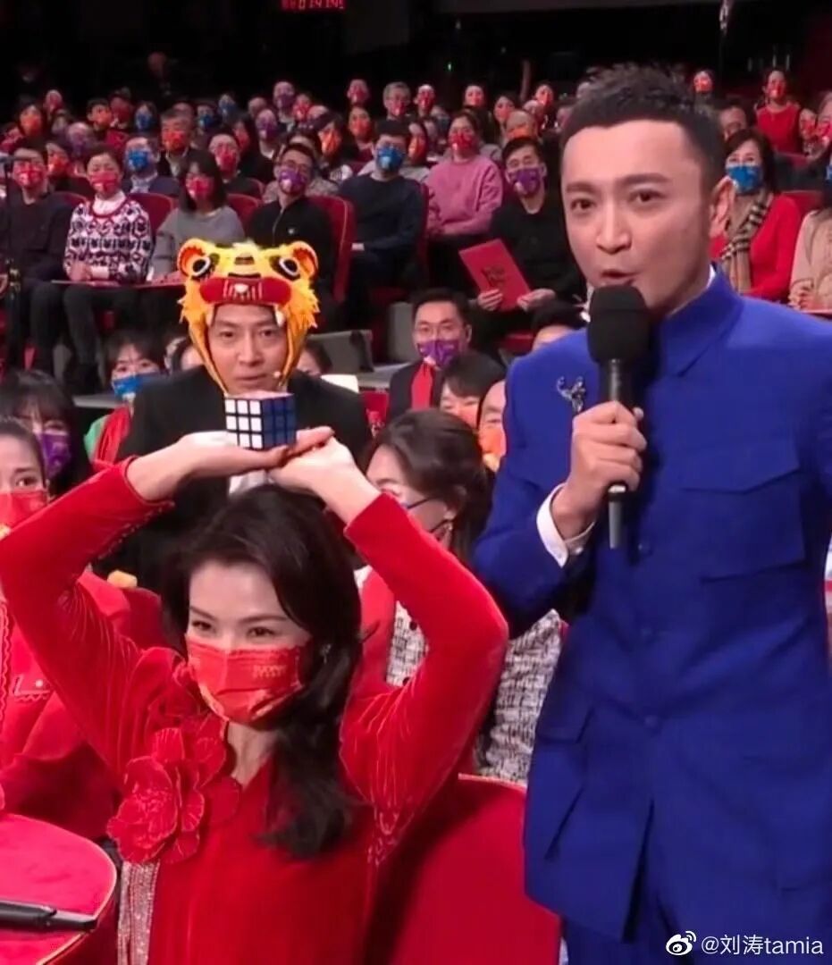 魔术师邓男子带来节目《迎春纳福》,他拿着魔方走到台下邀请贾乃亮、刘涛、张若昀互动,刘涛紧张直呼“我不是托”。随后“刘涛是托”话题登上微博热搜榜,她回应道:“是!我托住了虎头虎脑的小撒。”微博配图是一张借位图,她托着魔方与撒贝宁戴着虎头帽的脑袋形成视觉错位,仿佛托住了撒贝宁的头。![]()