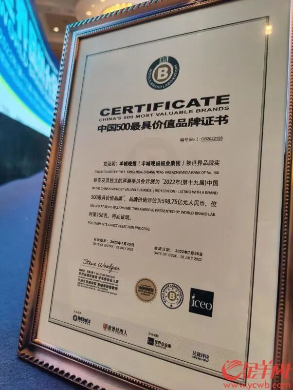 世界品牌实验室7月26日在北京发布2022年《中国500最具价值品牌》分析报告。其中,《羊城晚报》品牌价值增至598.75亿元人民币,再创新高的同时,继续蝉联全国晚报第一名。