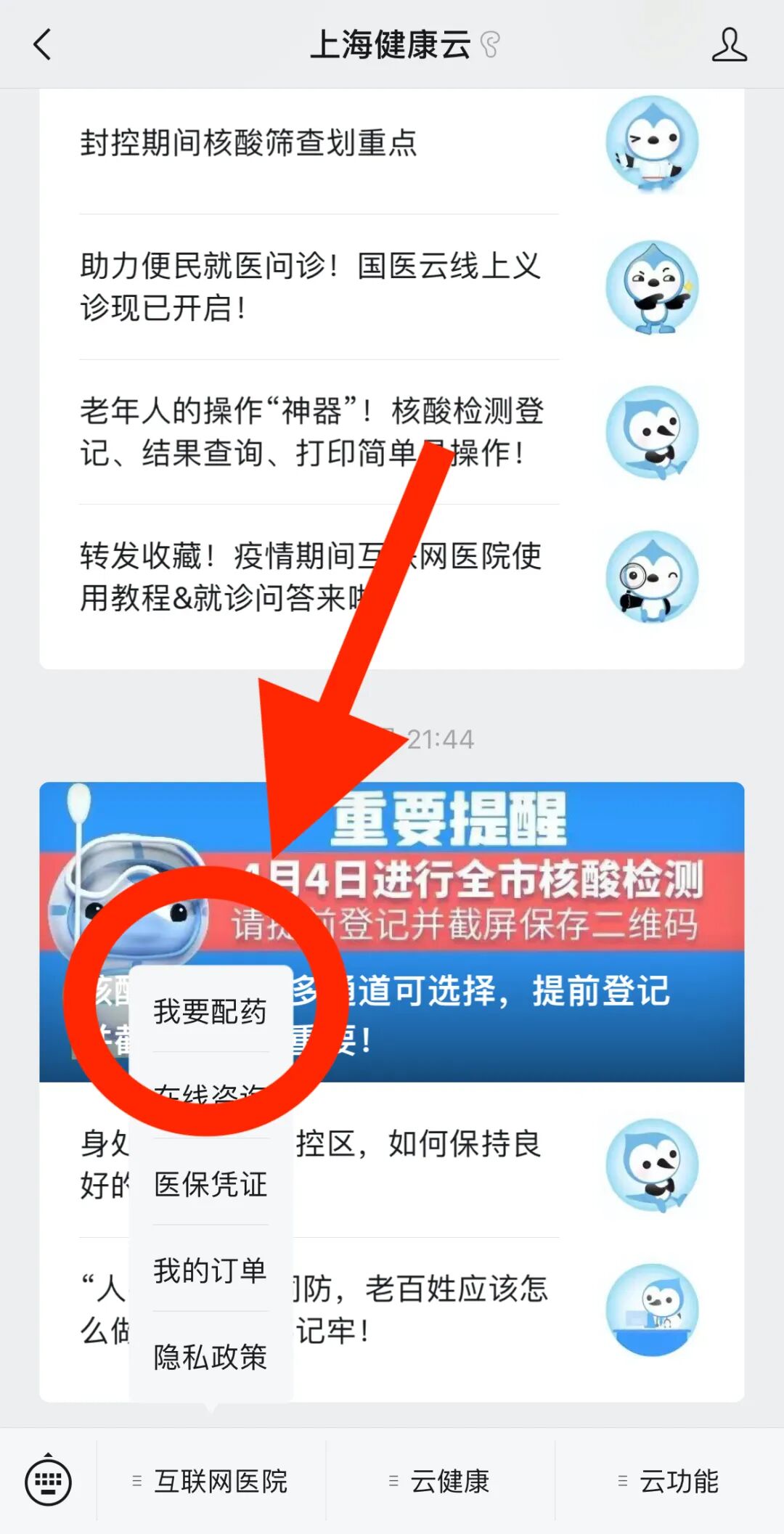 进入“上海健康云”微信公众号,在菜单栏点击【我要配药】即可进入配药页面↓