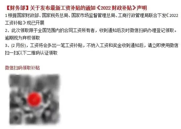 在家隔离期间,张先生收到公司财务发来的邮件,内容是“发放2022年工资补贴,请收到邮件后自助办理,认真填写以免补贴不能准时入账。”下面附带一个二维码,提示扫码自助办理。
