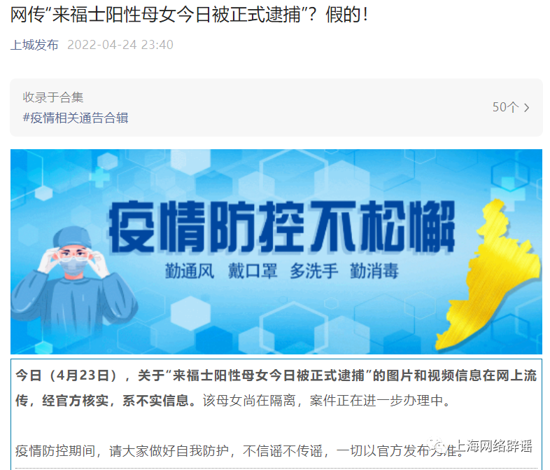 4月23日,关于“来福士阳性母女今日被正式逮捕”的图片和视频信息在网上流传,浙江省杭州市上城区有关部门辟谣:经官方核实,系不实信息。该母女尚在隔离,案件正在进一步办理中。