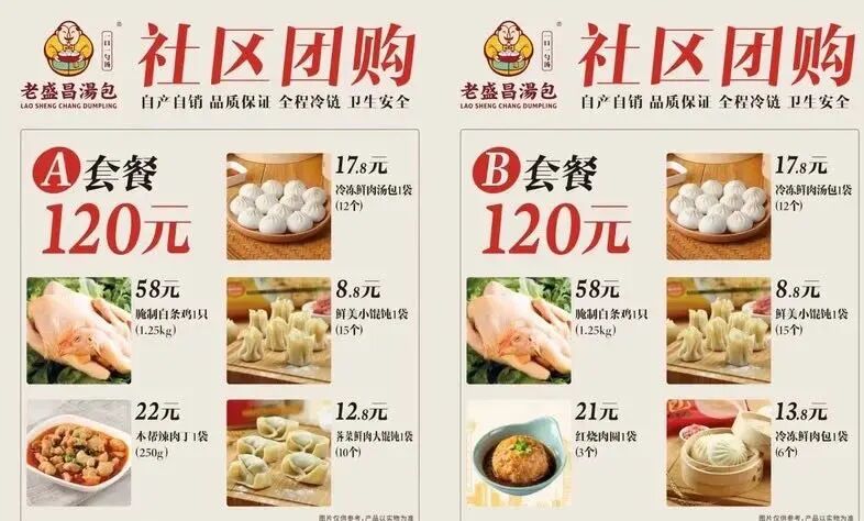 老盛昌也推出了120元一套的社区团购套餐,60份以上成团。居民可通过老盛昌微信公众号、企业微信订阅号下单。