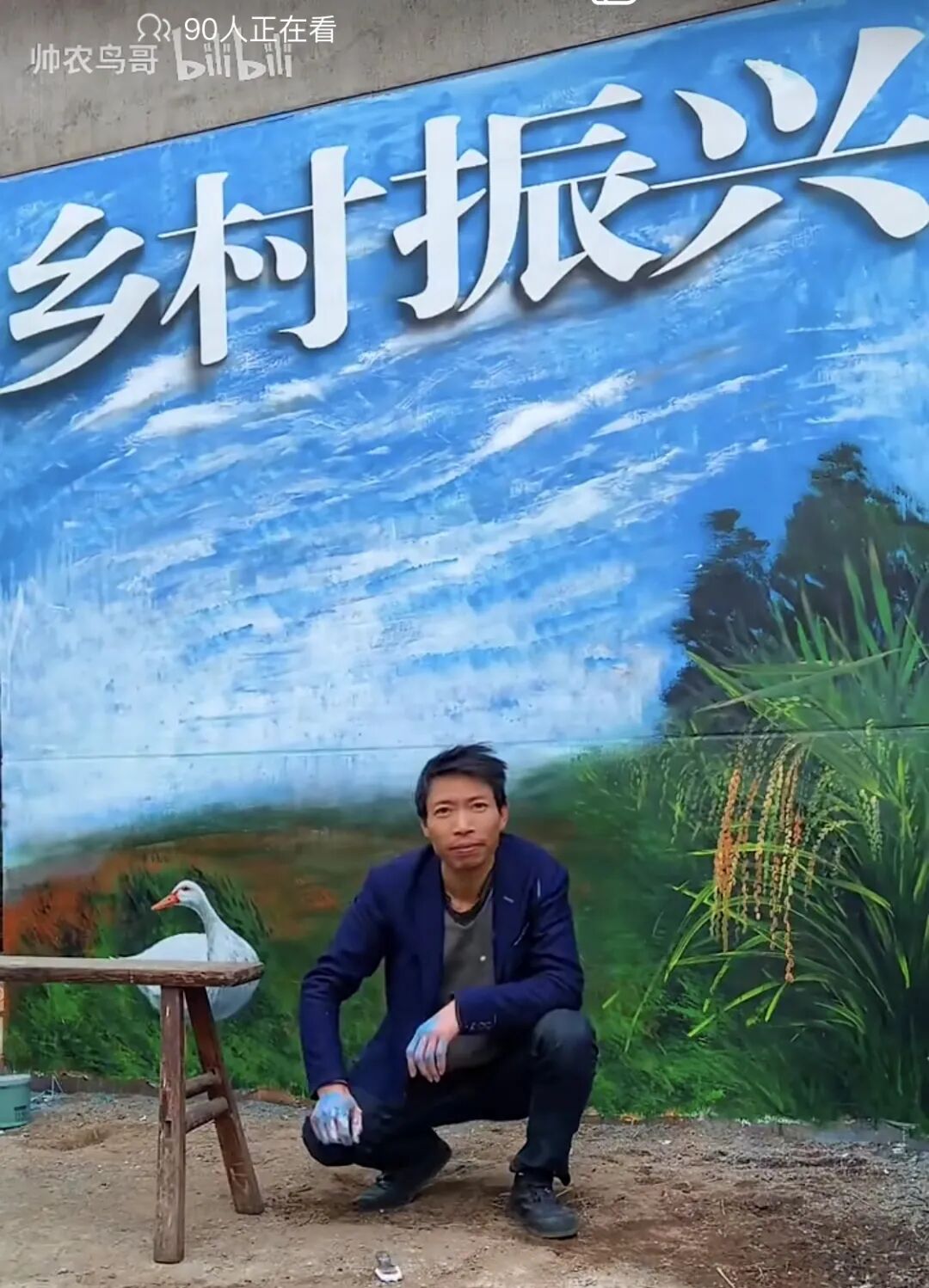 但这些视频,又没有被拍成他一个人的“星光大道”或“我要上春晚”的舞台。他是有点装,但不作;是蛮土的,但又绝对不俗。院子中的狗崽负责卖萌,村路上的土狗专门在他撩发时扭头,偶尔路过的村民可以引发剧情,而他美如“张曼玉”的老婆也需要常常“持靓行凶”。被“甲方”要求画土狗的墙壁对面,是干净的水泥路与取代了土屋的三层小楼。镜头中一扫而过的灯泡、橡胶手套等垃圾,最终都会出现在村路边的分类垃圾桶内。曼玉姐在鸟哥手机里的称呼是“主人”,她虽然成日将家中大小事情都推给鸟哥一手操办,还时时压榨鸟哥画画赚来的外快,但她也是鸟哥“家庭弟位”最大的拥护者,还会把钱用来给他买新的蓝色战袍……鸟哥的每幅作品,格局都很打开。