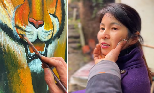 或是二话不说,便用木头雕刻出冰墩墩和大老虎,其间不忘撩发和擦鞋数次,惊艳得网友们直呼:“优雅永不过时”。谈起画画,鸟哥更有一手了。除了上文中出现过的“花招式”,他还尤其擅长“点睛”。比如对着老婆的样子画老虎,比如对着镜子画土狗。![]()