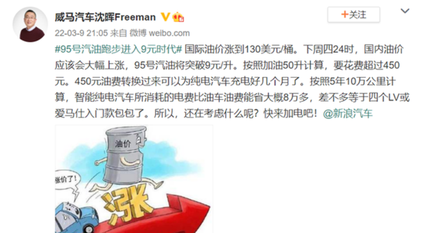 十天前的3月9日,油价正一路高歌猛进的时候,威马汽车创始人沈晖表示:“按照加油50升计算,要花费超过450元。450元油费转换过来可以为纯电汽车充电好几个月了。”紧接着,他还替大家算了一笔账,按照5年10万公里里程计算,开纯电汽车能比开燃油车省下大概8万块油费,“差不多等于四个LV或爱马仕入门款包包了”。