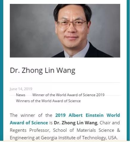 据“中国能源报”微信公众号消息:6月14日,2019年度“阿尔伯特·爱因斯坦世界科学奖”(Albert Einstein World Award of Science)揭晓,中国科学院北京纳米能源与系统研究所首席科学家、国科大纳米学院院长、美国佐治亚理工学院终身讲席教授王中林,凭借在微纳能源和自驱动系统领域的开创性成就,斩获这一世界性的大奖,成为首位获此殊荣的华人科学家。