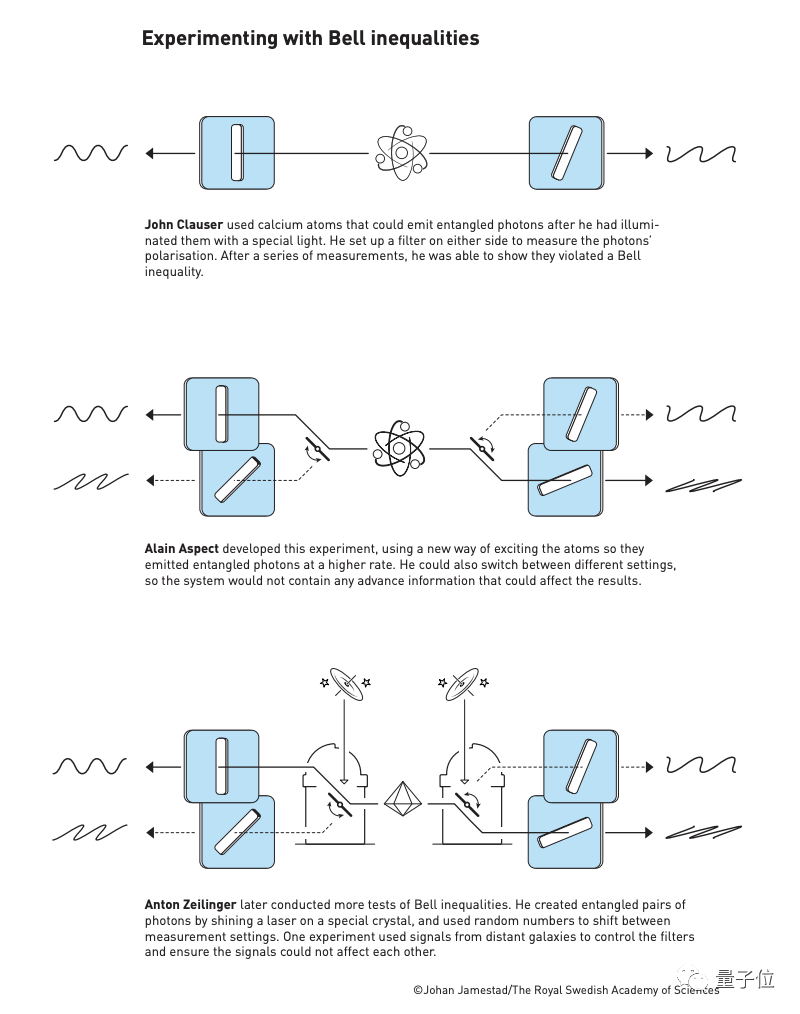 今年的物理学奖颁向量子纠缠的三位科学家,他们分别是阿兰·阿斯佩Alain Aspect,约翰·克劳泽John F. Clauser以及安东·塞林格Anton Zeilinger,以表彰他们用纠缠光子进行实验,证明了贝尔不等式不成立,并以此开创量子信息科学。