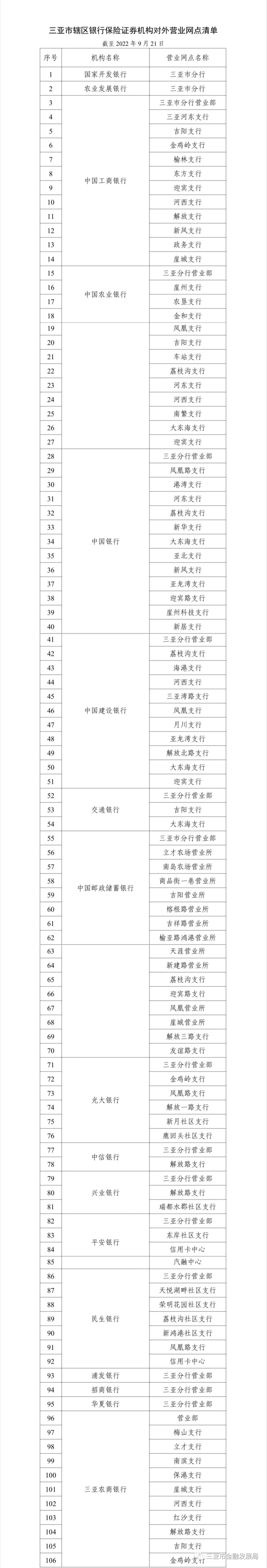 记者从三亚市金融发展局获悉,在三亚市新型冠状病毒肺炎疫情防控工作指挥部的指导下,截至9月21日,三亚正常营业的银行网点125个、保险网点35个、证券期货网点13个(附后)。全市尚余37个银行保险证券网点暂未对外营业。