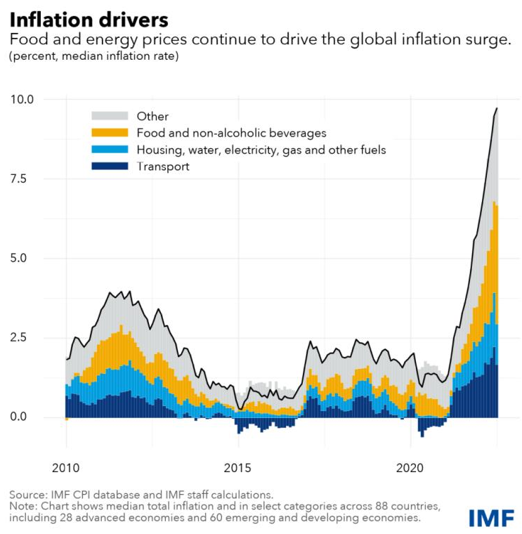 除了俄乌冲突,今年全球通胀爆表,尤其是在欧美国家,美国、英国、德国等CPI数据创下近半个世纪以来新高,IMF统计数据显示,自2020年疫情以来,全球交通、食品、房屋等各项生活成本都在飙升。