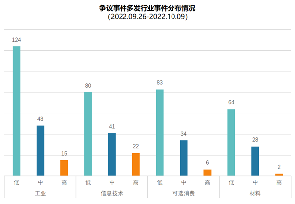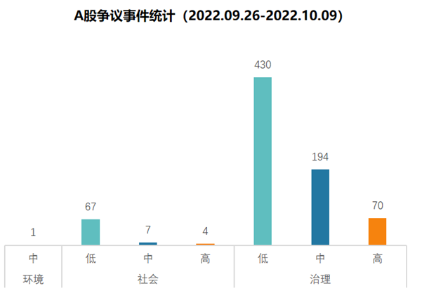 9月26日至10月9日期间,A股市场共发生ESG争议事件773起,其中环境事件1起,社会事件78起,治理事件694起。低风险事件497起,中风险事件202起,高风险事件74起。