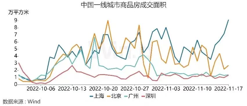 2022年11月1日至11月17日,一线城市中商品房成交套数最多、成交面积最大的是上海,当月累计达10578套、96.62万平方米。11月上海日均商品房成交套数为622.24套,日均商品房成交面积为5.68万平方米,均高于10月日均成交水平。北京、广州、深圳的11月日均商品房成交均低于10月水平。