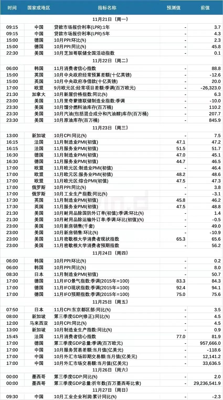 11月21日-11月27日期间,推荐关注以下重点指标更新日历:
