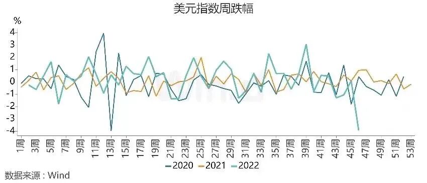 随着10月份美国通胀数据超预期回落,2022年11月4日-11月11日期间,美元指数周跌幅达-3.95%,创下自2020年4月份以来的最大周跌幅。11月14日-11月17日期间,美元指数从小幅反弹后的106.8986回落至106.6784。