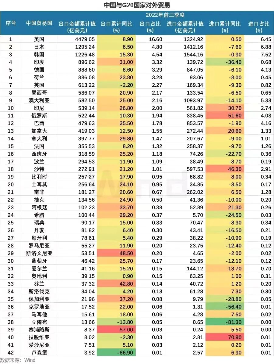 2022年前三季度,中国对G20国家出口金额总计达1.67万亿美元,占中国出口金额的62.03%;中国对G20国家进口金额总计达1.15万亿美元,占中国进口金额的55.83%。其中,出口金额排名前5的贸易国依次为美国、日本、韩国、印度、德国。进口金额排名前5的贸易国依次为韩国、日本、美国、澳大利亚、巴西。