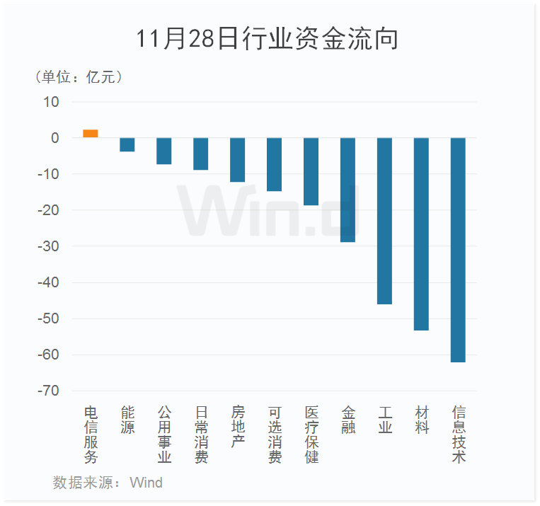 从11月28日行业资金流向来看,主力资金净流出200多亿元,多数板块净流出。其中,信息技术板块净流出60多亿元,位居首位;材料、工业、金融、医疗保健等板块亦大幅净流出。仅电信服务板块小幅净流入。