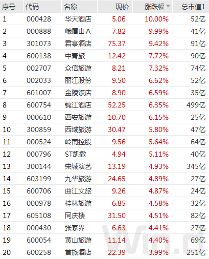 从涨幅居首的消费者服务板块来看,华天酒店、峨眉山A涨停,君亭酒店、中青旅、众信旅游、丽江股份、金陵饭店、锦江酒店、西安旅游、西域旅游、岭南控股、ST凯撒、宋城演艺、九华旅游、曲江文旅等多股亦涨幅居前。