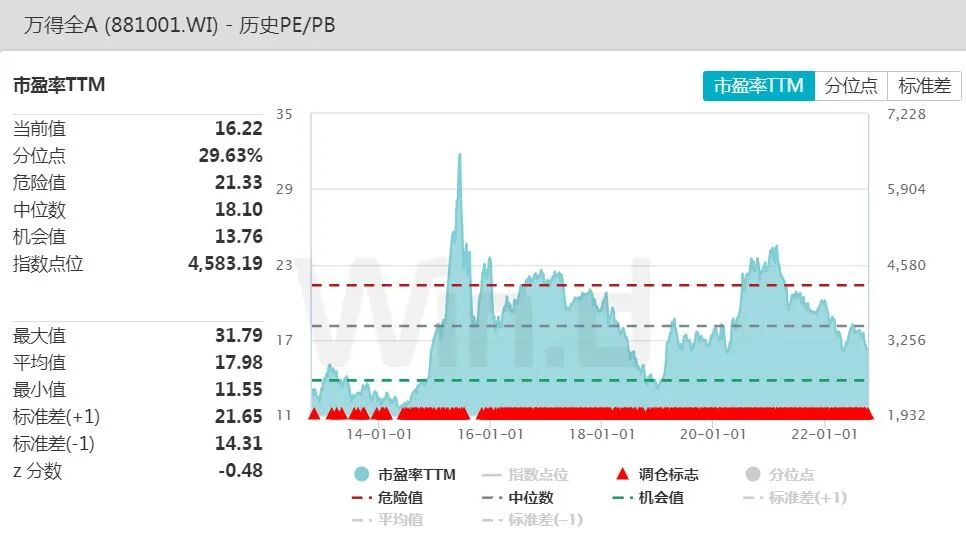 本周一,万得全A指数市盈率已经低于今年上半年创下的低点。