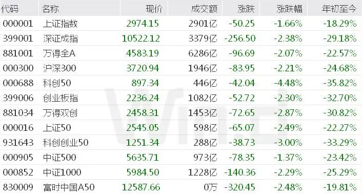 上证指数再次跌破3000点,最低触及2968.28点,收报2974.15点。深证成指和创业板指跌幅超2%,科创50指数跌逾4%。