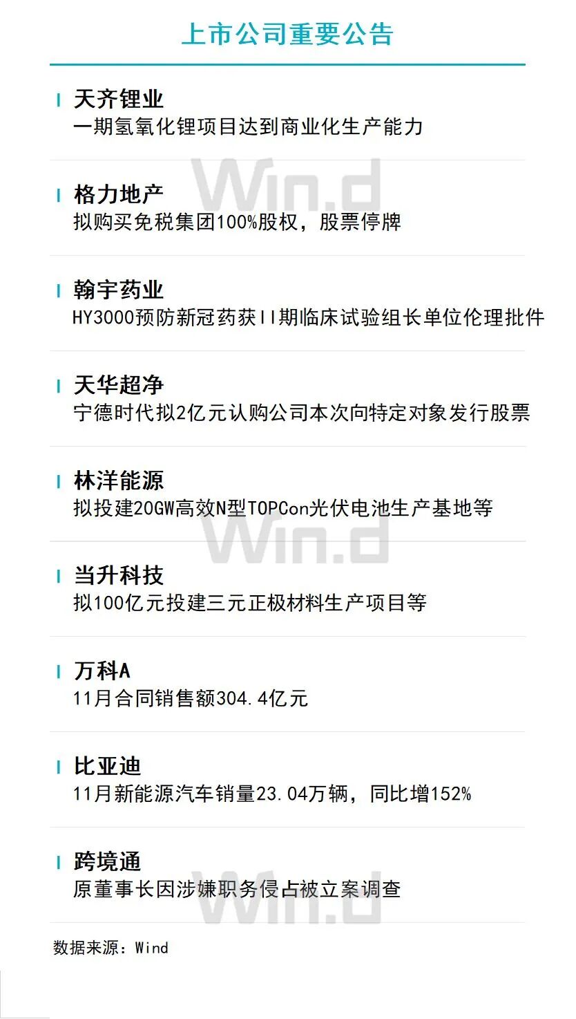 8、比亚迪披露11月产销快报显示,11月新能源汽车产销量分别为23.01万辆和23.04万辆,同比增长均超1.5倍;其中,海外销售新能源乘用车1.23万辆,环比增近三成。当月动力电池及储能电池装机总量约为11.003GWh,2022年累计装机总量约为78.684GWh。