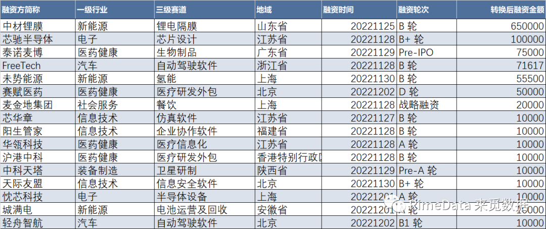 医药:11 月 29 日,泰诺麦博宣布已于近日完成约 7.5 亿元 Pre-IPO 轮融资。本轮融资由格力金投、熙诚金睿领投,倚锋资本、申宏格金、嘉兴维龙、海创安达、新太格、沁湾资本等跟投,老股东康哲药业、无锡国联、金航集团持续加码。本轮融资款将主要用于泰诺麦博生物在研管线的持续推进、商业化生产设施的建设以及市场营销的开拓。泰诺麦博是一家面向全球的处于临床阶段的创新型生物制药公司,以研发原创性的天然全人源单克隆抗体新药为主营业务。截至日前,该公司累计融资额已达 22 亿元。