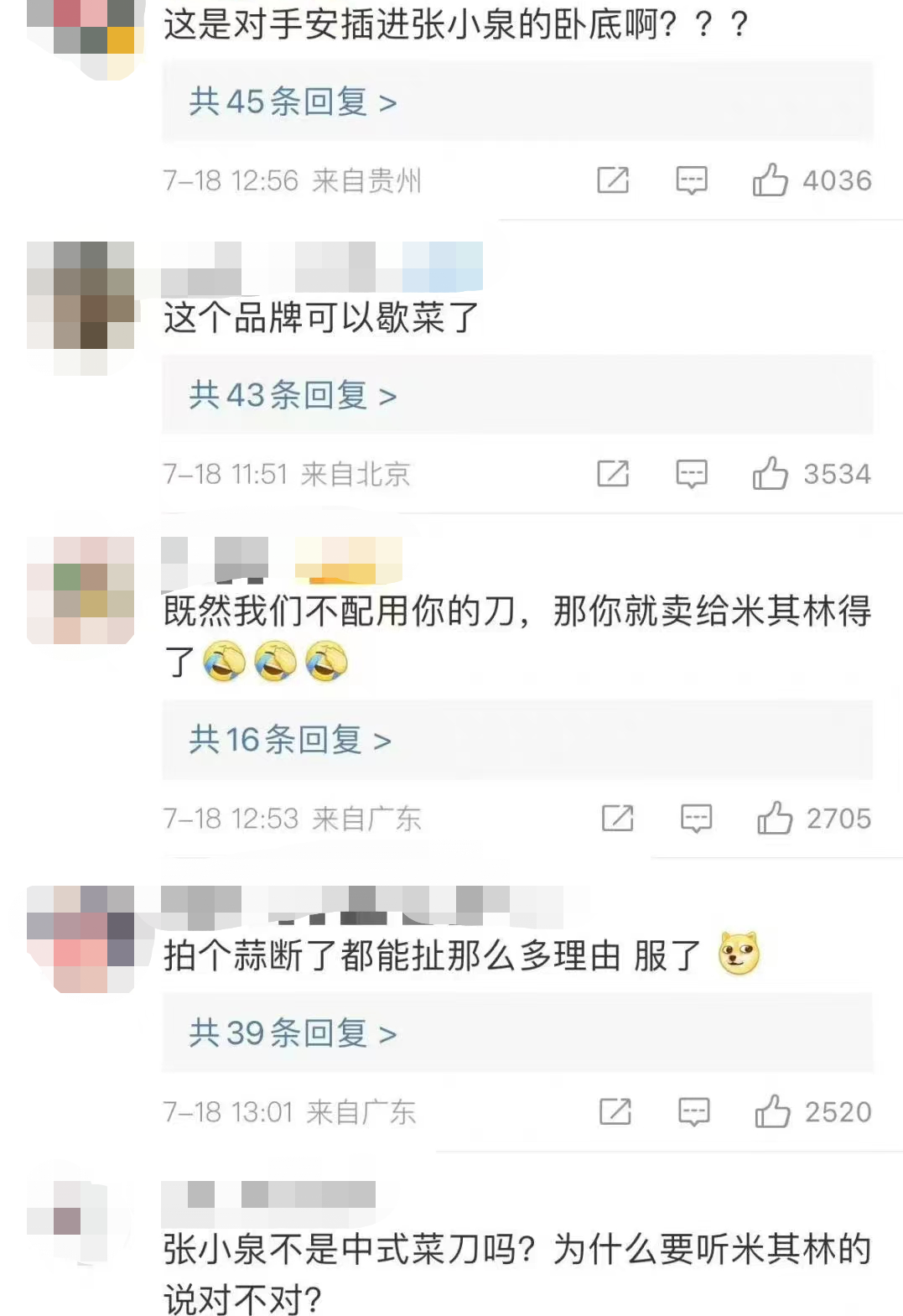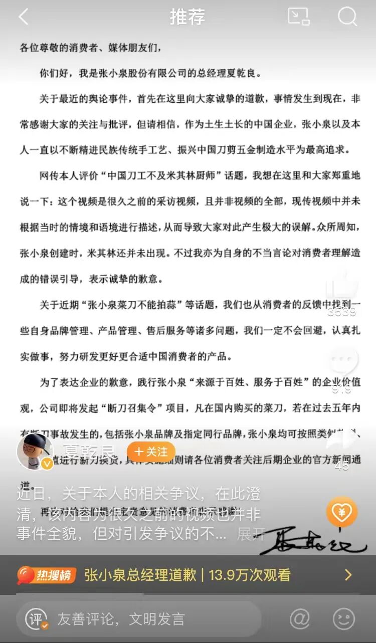 18日,张小泉总经理在个人账号@夏乾良 发文回应。