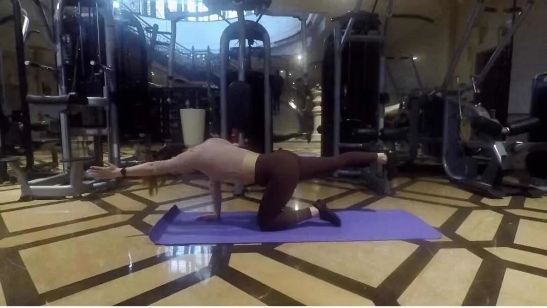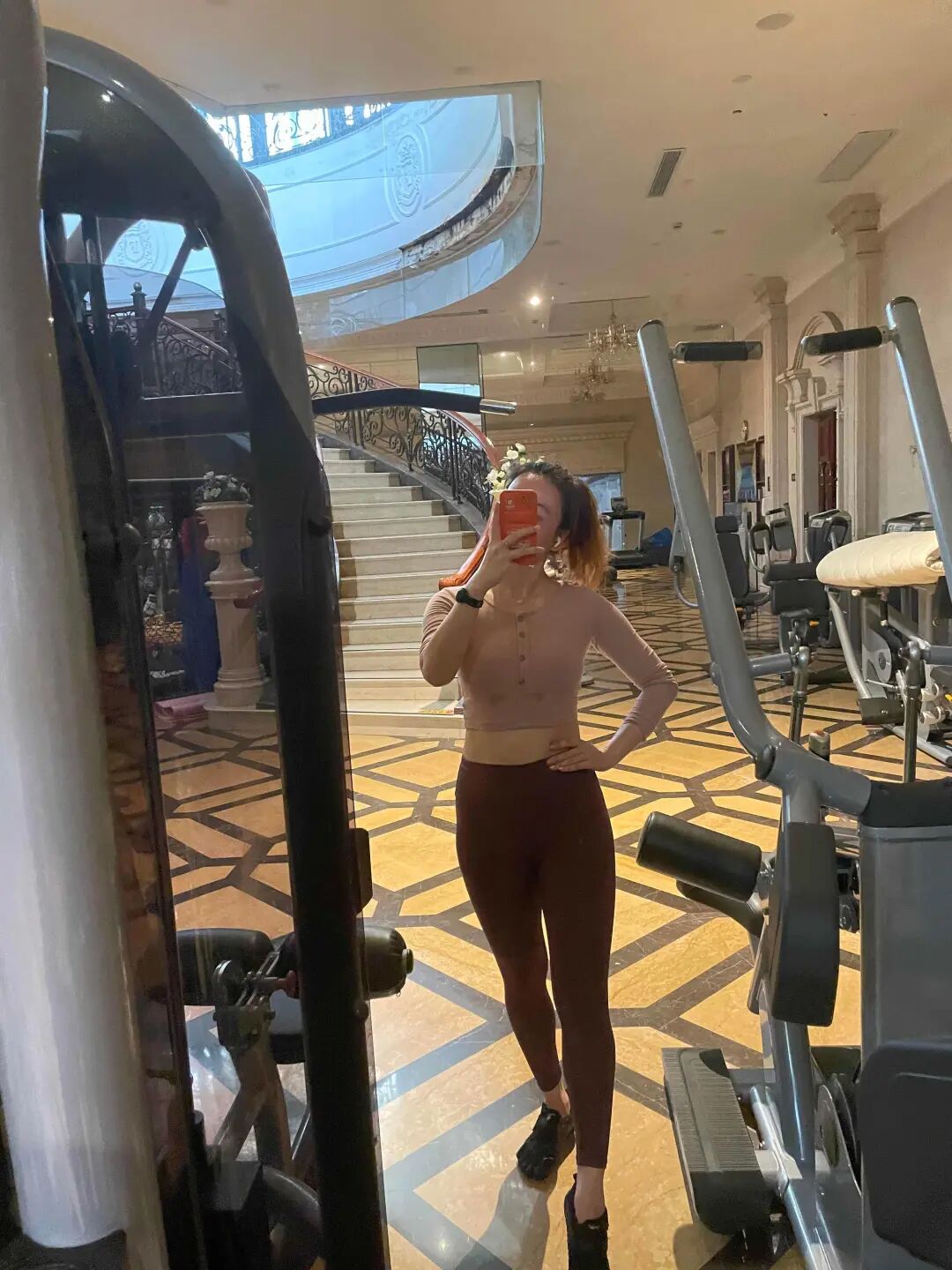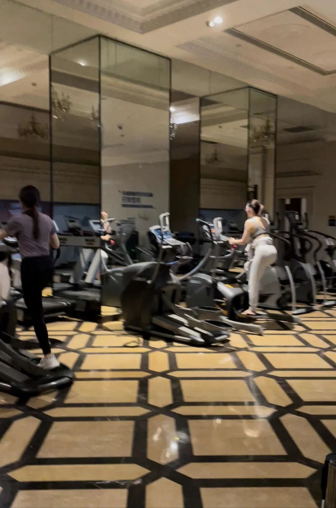 王奥在健身房做运动,她怀念当时大家一起健身运动,互相‘卷’的氛围。