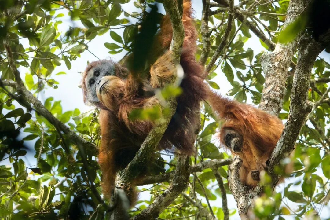 一只雄性达班努里红毛猩猩与一只幼年雌性猩猩在它们雨林中的避难所向下观望,摄于苏门答腊岛巴唐托鲁。