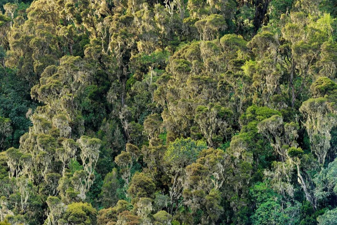 非洲中部卢旺达的山坡上一片通常被云雾笼罩的森林,它由巨型欧石楠树组成。其中一些树接近20米高,它们的枝干覆满苔藓和地钱,因雾气和雨水而保持湿润。