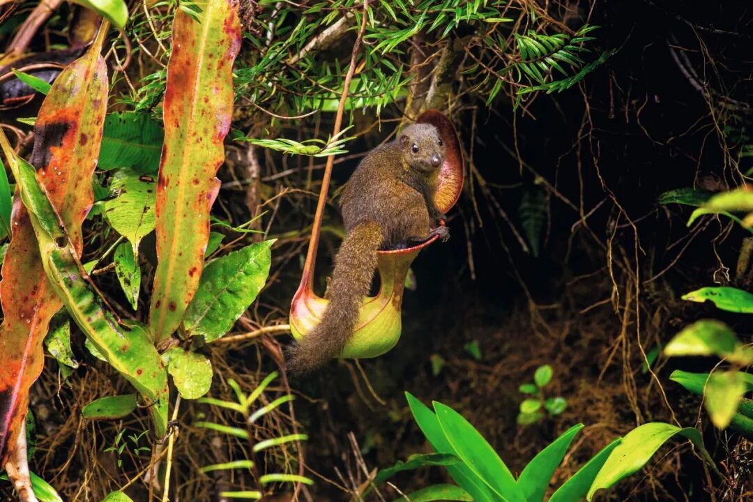 加里曼丹岛京那巴鲁山,一只山树鼩(Tupaiamontana)在劳氏猪笼草上舔食营养丰富的蜜腺分泌物。这种猪笼草的结构是如此特殊,如果山树鼩想要舔到上方笼盖里的美食,就必须要把屁股对着下方“特殊设计过的马桶”。山树鼩在取食时,排便到下方的笼中,为笼内的液体增加氮元素。在这个奇特的交换过程中,每个物种都向对方提供了在它们共享的山地生境中所缺乏的营养物。