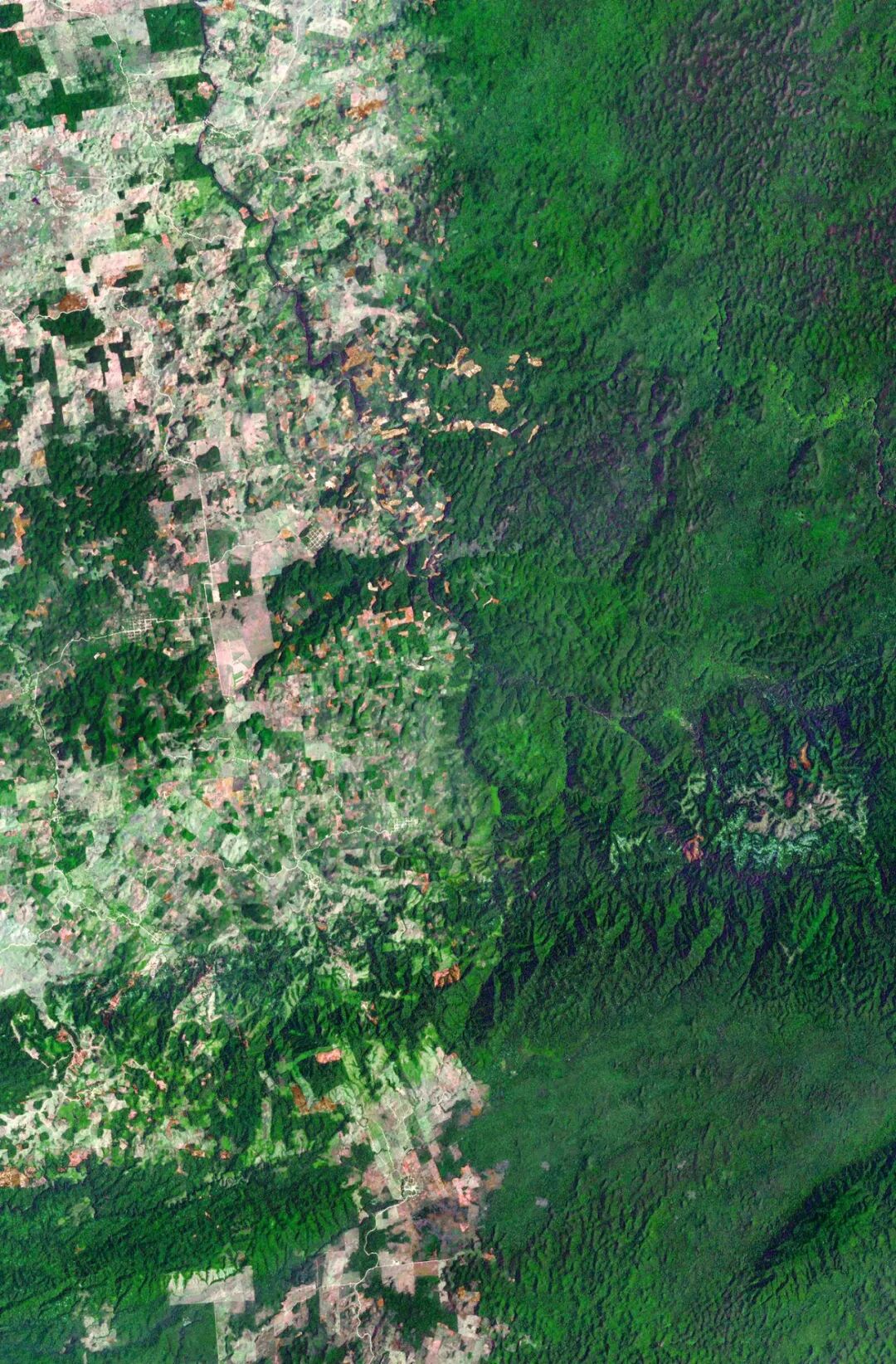 2016年危地马拉和伯利兹边界的卫星照片,显示了当政府土地政策存在巨大差别时不同的效果。左边是危地马拉的农田,跨过边界,右边便是伯利兹茂密的森林。这样的陆地卫星图像显示,1991—2014年,危地马拉的森林减少了32%,而伯利兹仅减少了11%。