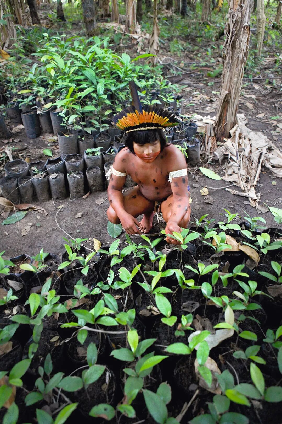 欣古河流域的一个年轻土著在检查幼苗,这些幼苗是由他所在的群体在巴西马托格罗索州的欣古土著公园采集的。