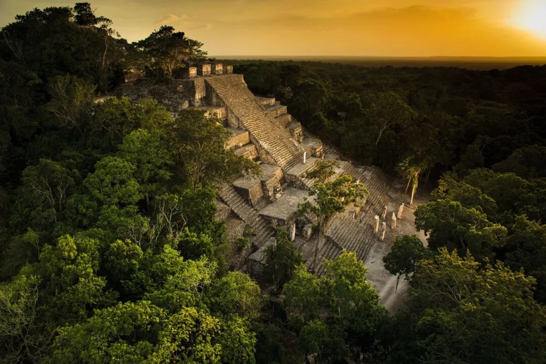 墨西哥东南部雨林中耸立的金字塔形坟墓废墟。这是公元7世纪玛雅“蛇之王朝”的首都卡拉克穆尔城的一部分,旱灾和战争共同带来城市衰落,森林在此重生。
