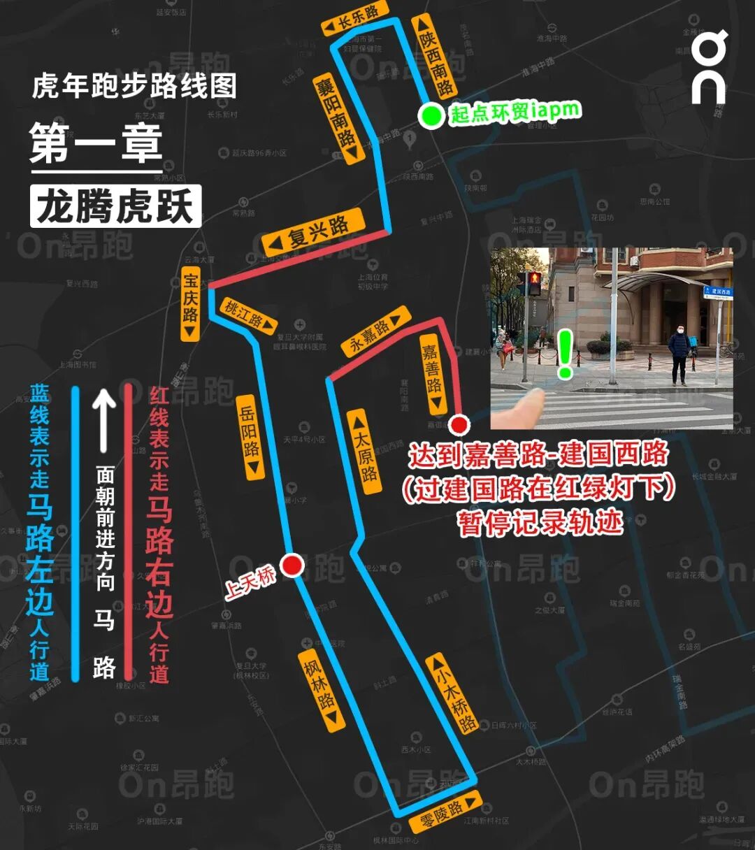 从设计线路图到完成路测,张望花了4天时间。经过数次尝试,他将整条路线分为三段,结合中华传统祝福语分别起名“龙腾虎跃”“虎踞龙盘”“虎虎生风”。他在路线图中标注了需暂停和重新开启定位记录的点位,以及需从马路路口靠左或靠右的人行道跑步经过的路段等。
