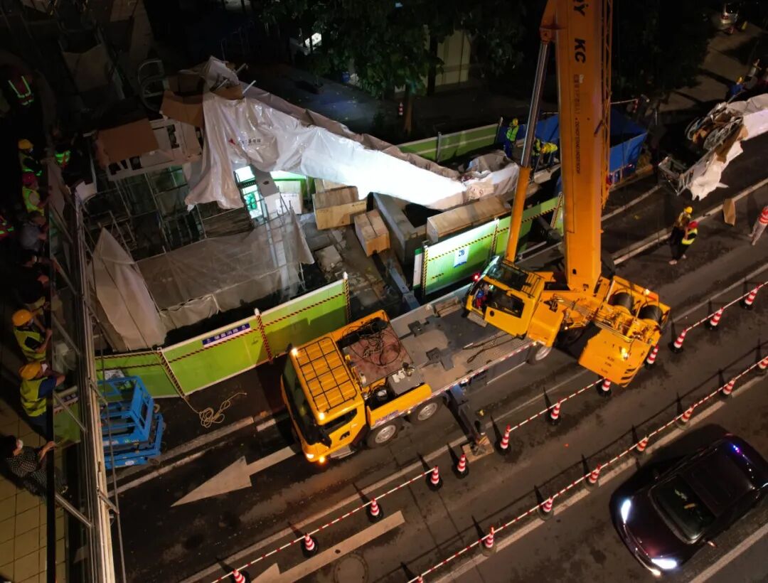 7月17日晚上23点,在徐汇区交警部门的大力配合下,工人们对肇嘉浜路两侧加装的两部自动扶梯进行吊装作业,经过近5个小时的紧张奋战,最终在7月18日凌晨4点前顺利完成了自动扶梯的主体吊装工作。