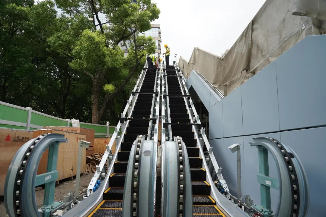 记者了解到,在疫情前,该工程已完成天桥两侧电动扶梯基础、钢立柱基础、钢楼梯基础的浇筑、北侧钢楼梯的安装,以及肇嘉浜路宛平路西北侧的样洞开挖、绿化搬迁、电力管线保护、围挡安装、脚手架搭设、信息管线搬迁及通行步道施工,更换了原有桥体装饰面板及其配套龙骨,对原有钢结构进行了除锈油漆涂刷。当前,工人们正在全力奋战抢夺工期,对吊装的自动扶梯进行为期约10天的零部件安装和运行调试工作。